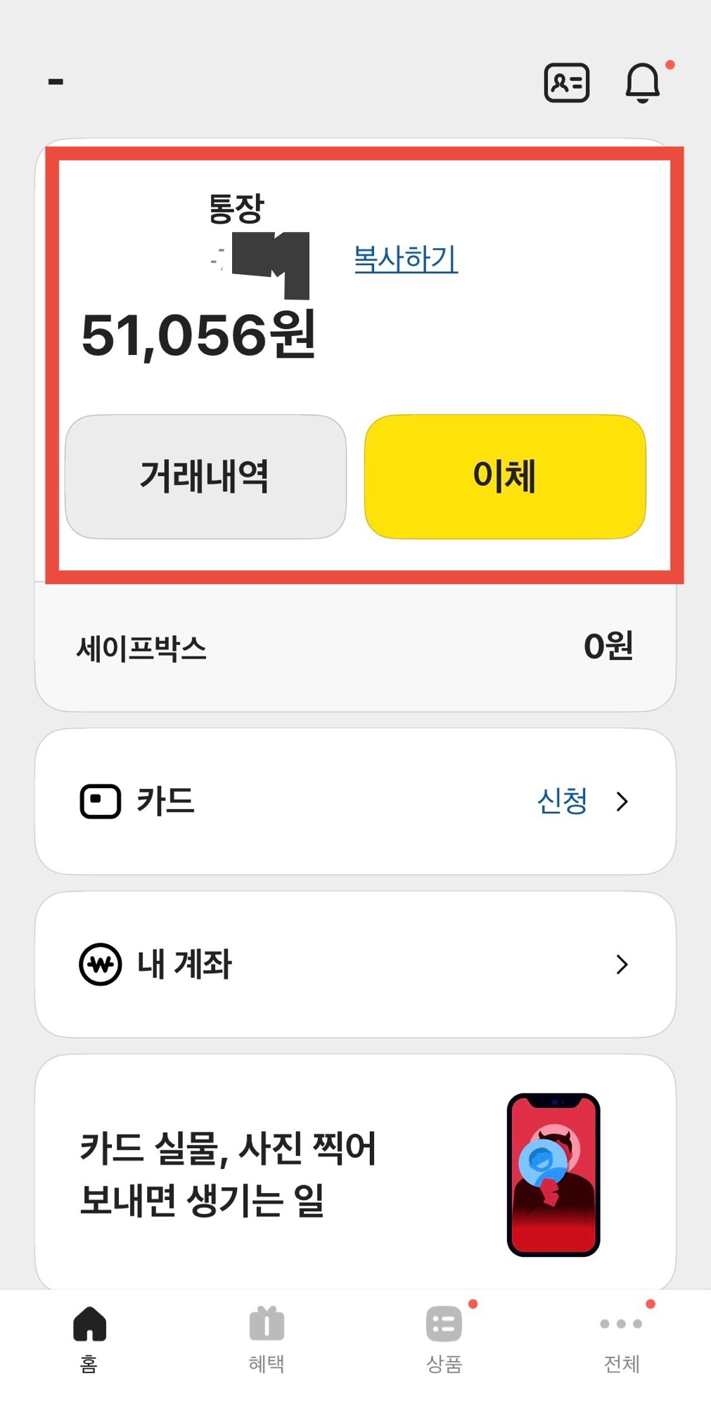먼저 카카오뱅크 앱에 접속한 뒤, 통장사본이 필요한 계좌를 선택합니다