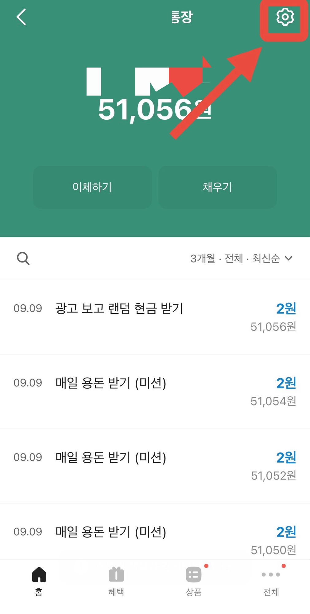 화면 오른쪽 상단의 톱니바퀴 아이콘(설정 메뉴)을 클릭하면 해당 계좌 관리 메뉴가 나타납니다