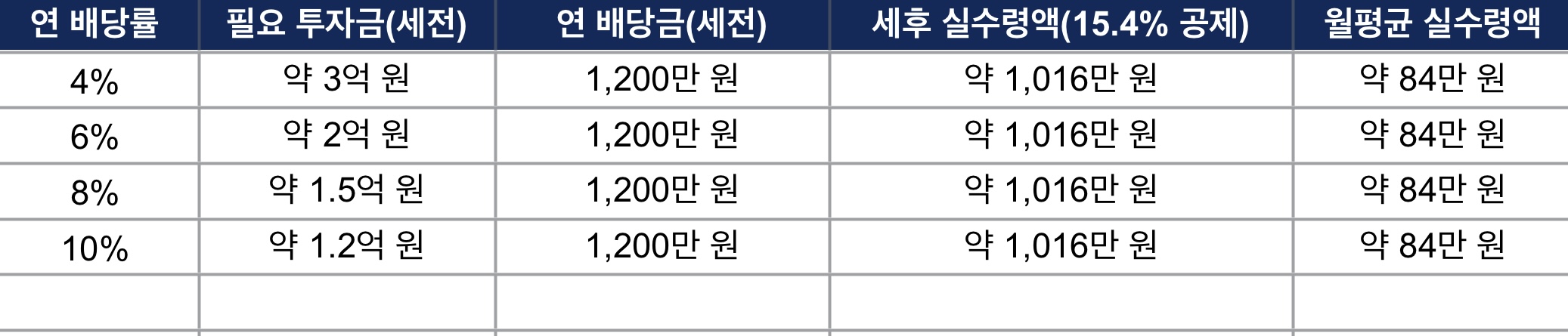아래 표는 연 배당률별로 월 100만 원 배당을 달성하기 위한 필요 투자금과 세후 실수령액을 정리한 예시입니다
