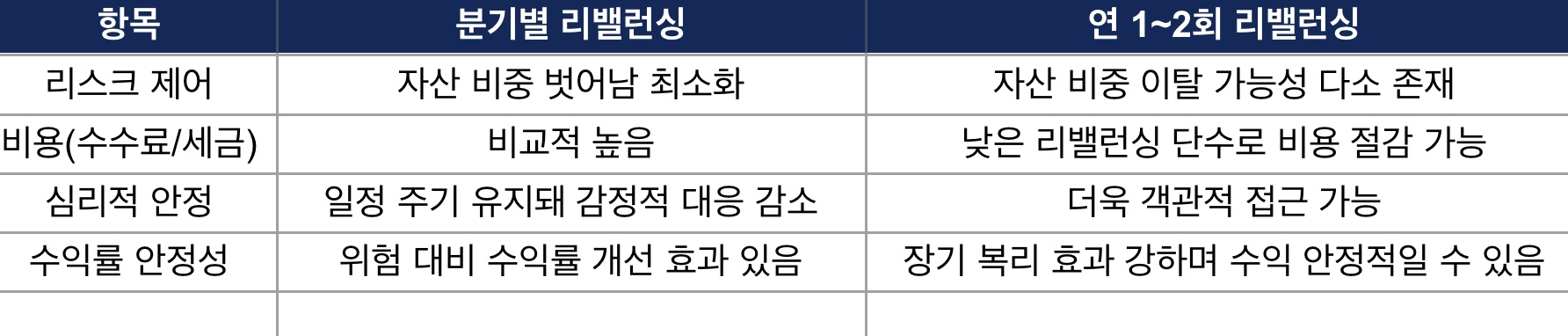 분기별 리밸런싱은 규율과 리스크 관리를 동시에 잡을 수 있지만, 비용이 문제라면 연 1~2회 주기의 리밸런싱이 더 현실적입니다